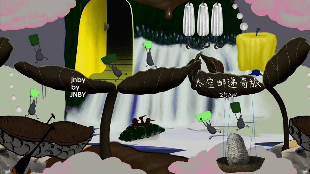 本次大秀上jnby by JNBY正式推出2025秋冬系列——“太空邮递奇旅”,以充满想象力的太空冒险为灵感,通过超现实主义的艺术表达,将童真趣味、实用功能与美学理念深度结合,为小朋友们精心打造一场自由、希望与探索相互交织的时尚旅程。秀场整体幻化为一个充满奇思妙想的童趣乐园,以富有想象力的线条与互动艺术装置装点空间。视觉呈现上,LED屏幕化身为会呼吸的动态绘本,呈现手绘风格的流动星河与生长藤蔓,与秀场氛围浑然一体。它不仅是一场童装的发布,更是一部献给大小朋友的“超现实童话剧”,将无垠的宇宙探险与温暖的奇幻旅行情感巧妙融合,构筑出一个既充满想象又诗意盎然的童年梦境。