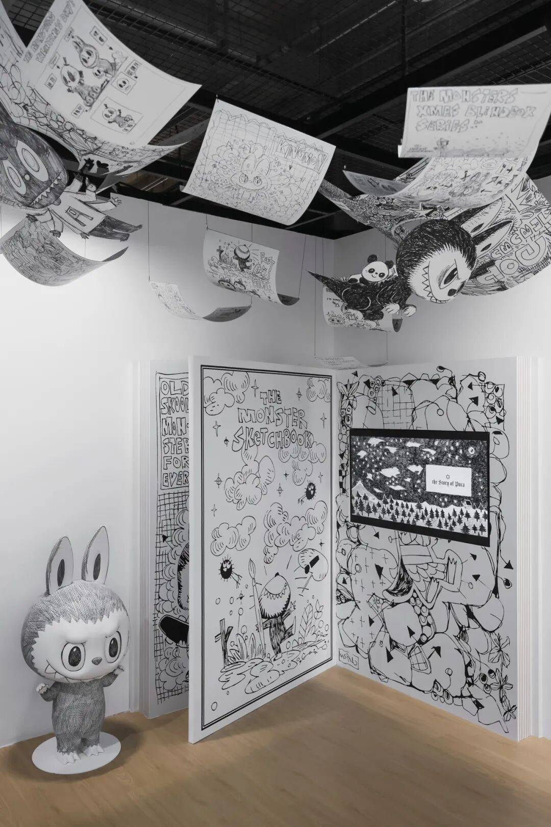 展览共分为六大主题区域,观众可沉浸式感受THE MONSTERS的奇幻世界:“奇幻森林” 区域还原了LABUBU与精灵伙伴居住的奇幻森林场景; “艺术回廊” 区域展出了艺术家龙家升的原画作品,呈现每个IP角色从概念到成型的完整过程;“手稿研究室” 则汇集百余张珍贵手稿,重现每件作品诞生的最初时刻;“光影游乐场” 在灯光渐暗之际,悄然开启一场妙趣横生的游戏;“镜屋” 陈列了自2015年至今的THE MONSTERS公仔。此外,在户外广场上有来自THE MONSTERS家族的KING MON化身为6米高的雕塑,指向上海的地标建筑——东方明珠。