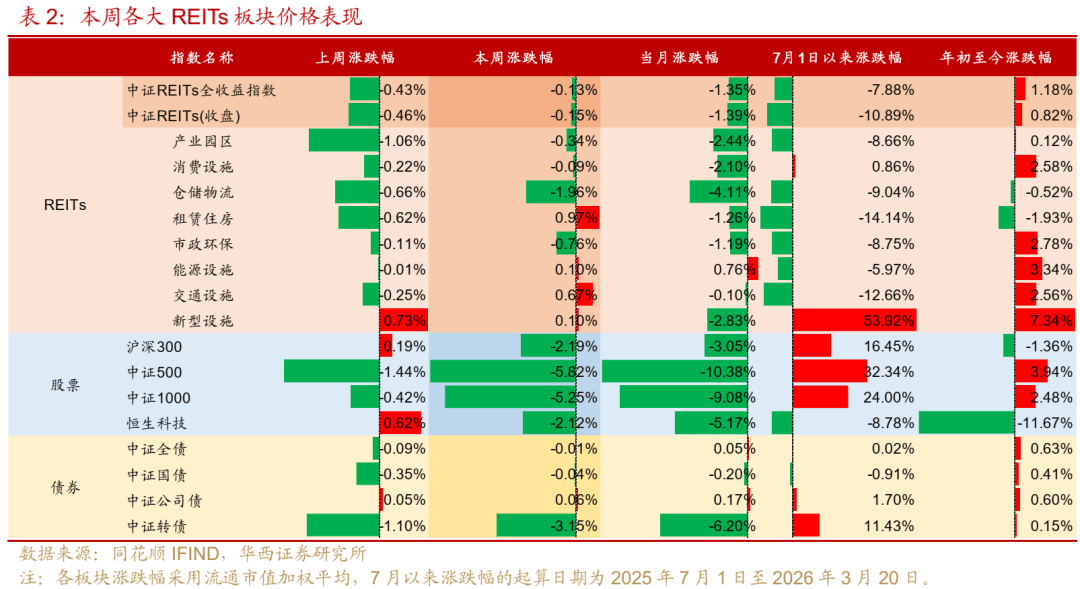 能源设施本周整体向好,涨幅靠前的是华夏华电清洁能源(+1.08%)和中信建投明阳智能新能源(+0.53%),跌幅靠前的是工银蒙能清洁能源(-0.52%)。中东战争背景下,权益市场有石油涨价的替代逻辑、算电协同的两条主线。石油涨价的替代逻辑,涉及大能源概念。“算电协同”则是在2026年政府工作报告被首次提出,要实施超大规模智算集群、算电协同等新基建工程。在此背景下,关注能源板块后续区域消纳、上网电量、上网电价的稳定性和需求端的变化。留意中信建投国家电投新能源、中航京能国际能源将于2026年3月29日分别解禁25%、17%。