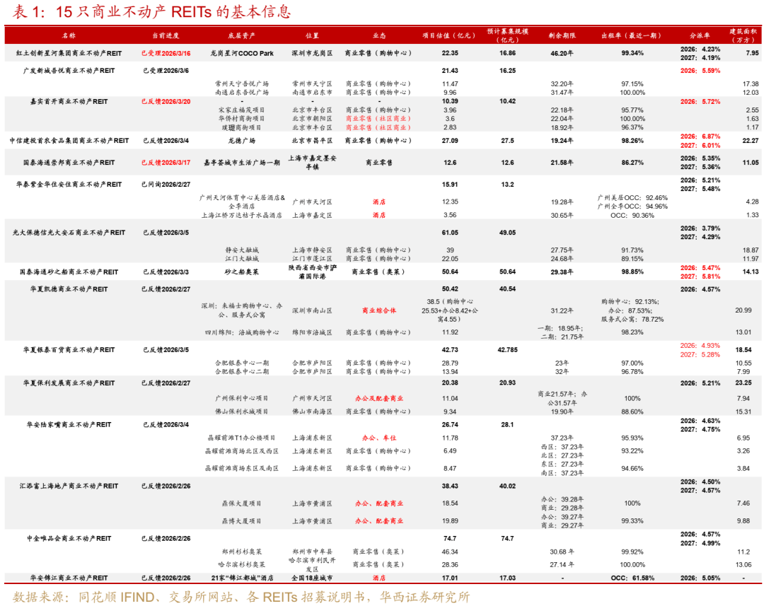 2026年3月16日,广东宏川智慧物流股份有限公司(002930.SZ)发布公告,公司审议通过了关于开展基础设施公募REITs申报发行工作及相关授权事项的议案,拟以部分下属公司持有的码头、储罐等基础设施作为底层资产,申报发行基础设施公募REITs,拟入池标的资产主要经营收入包含码头储罐综合服务、中转及其他服务等。2026年3月19日,天虹股份董事会审议通过了《公司关于撤回公募REITs申报的议案》,预计“中航天虹消费REIT”后续将进行撤回。